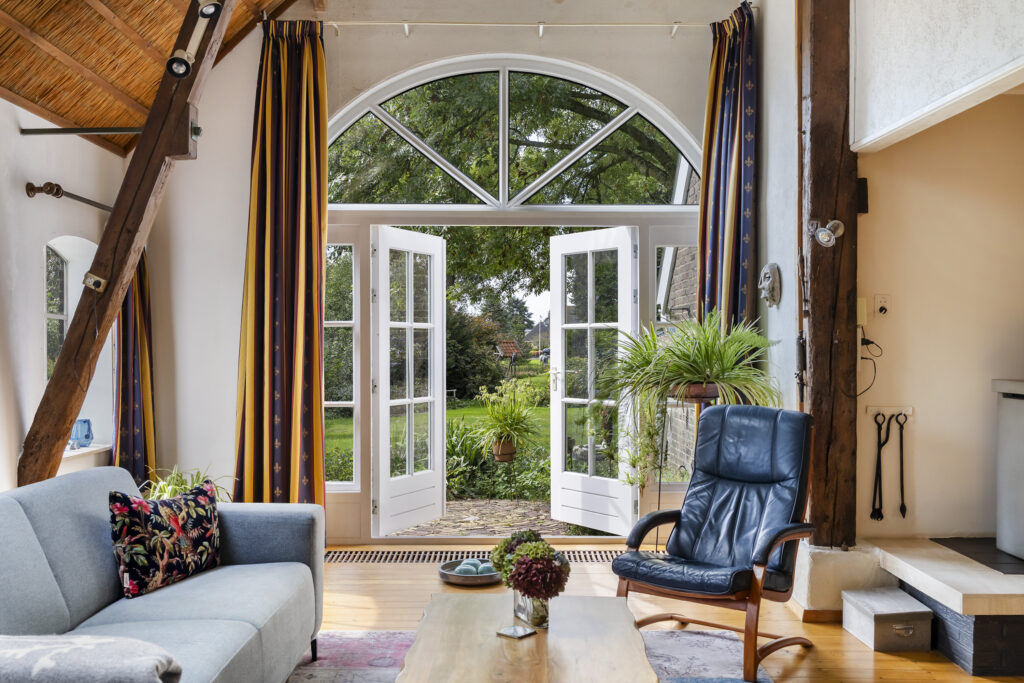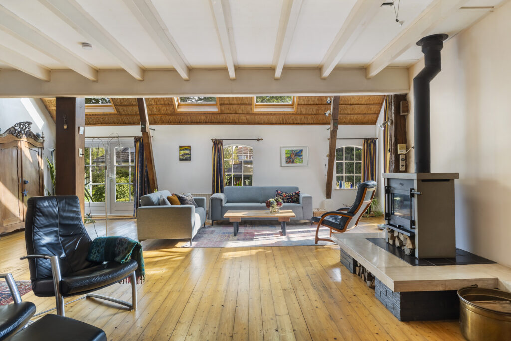 Grote hal met modern toilet, bijkeuken, berging, werkplaats, erg sfeervolle woonkamer met rookkanaal en houtkachel, deels verhoogd plafondconstructie, veel en grote raampartijen + oorspronkelijk bintwerk nog intact, woonkeuken (ca. 17 m²) met eenvoudige keukenopstelling.