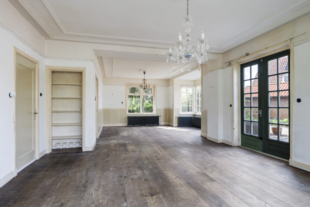 Vestibule, centrale hal, studeer-/werkkamer, toilet, keukenruimte (ca. 11 m²) met nette hoekopstelling, bijkeuken met toegang tot de provisiekelder (stahoogte), stijlvolle woonkamer (ca. 53 m²) met erkerpartij, parketvloer en dubbele tuindeuren en erg mooi op de zonzijde gesitueerd.