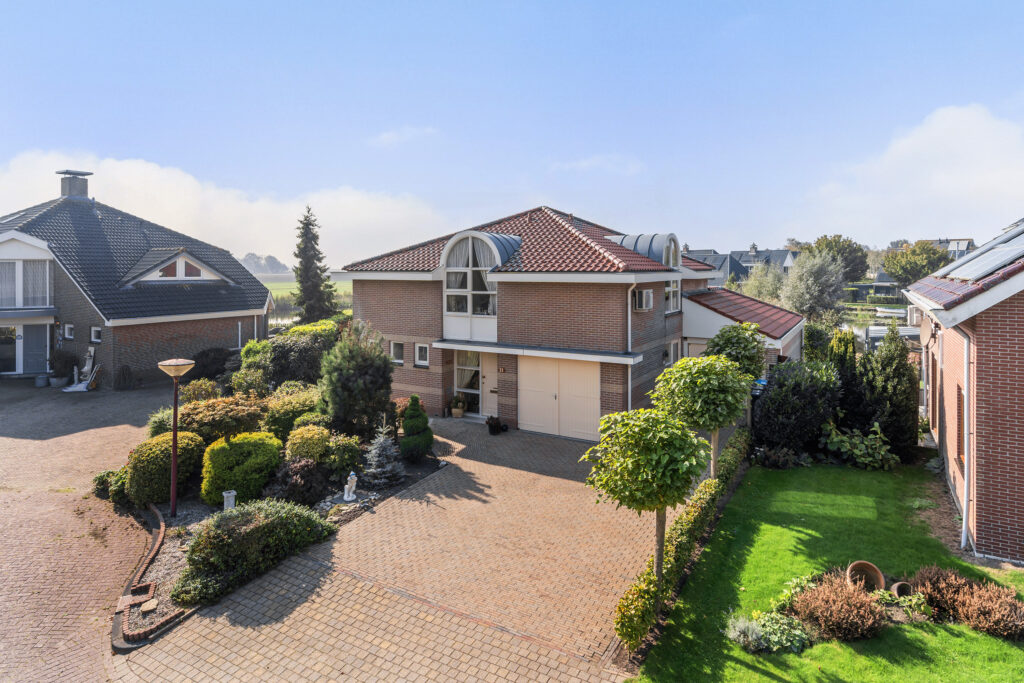 Het betreft hier een markante woning, gebouwd onder stijlvolle architectuur, met verrassende elementen, zoals half rond uitgevoerde dakkapellen. Een opvallende woning, op een zeer bijzondere plek! De woning is v.v. een slaapkamer + badkamer op de begane grond, zodat volledig gelijkvloers wonen ook mogelijk is. Rond 2000 is de woning aan de noordzijde fors uitgebouwd ten behoeve van een grote garage/hobbyruimte ter grootte van ca. 50 m², waarbij het ontwerp uitstekend is afgestemd op het hoofdgebouw. Geheel uitgevoerd in spouwmuur, v.v. verwarming en op afstand bedienbare overheaddeur. Een degelijke en solide woning, in goede staat van onderhoud, met o.a. vloerverwarming op de gehele begane grond en airco in de woonkamer en op de eerste verdieping. De woning beschikt over een energielabel C.
