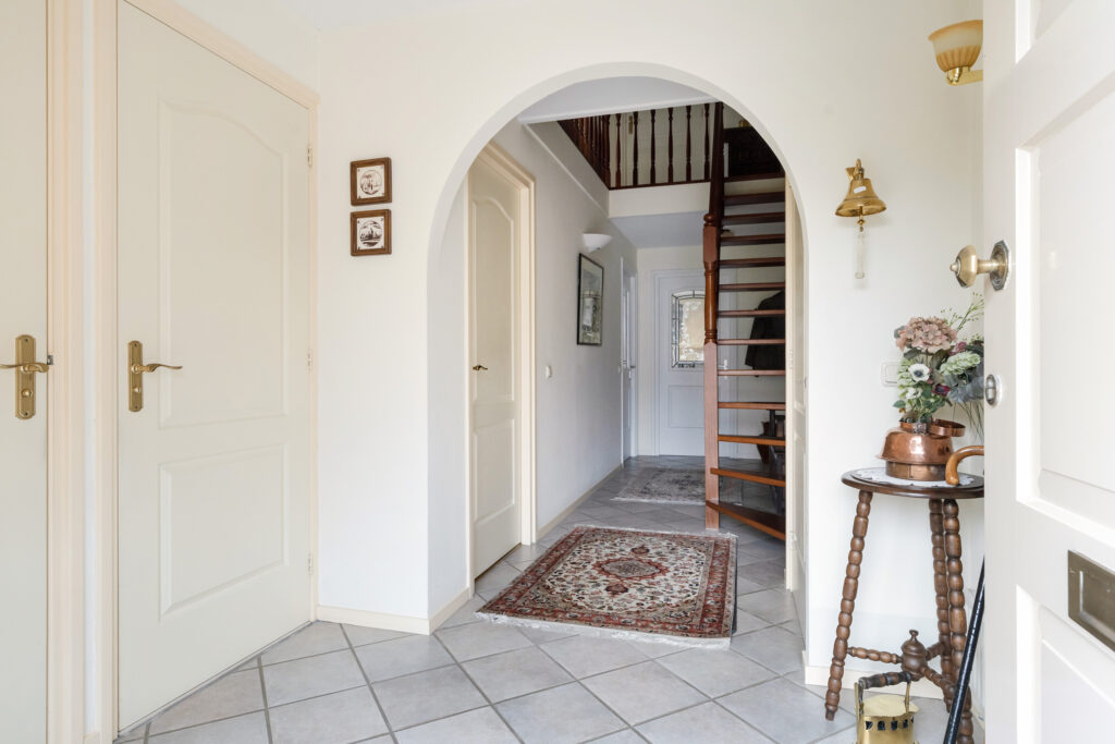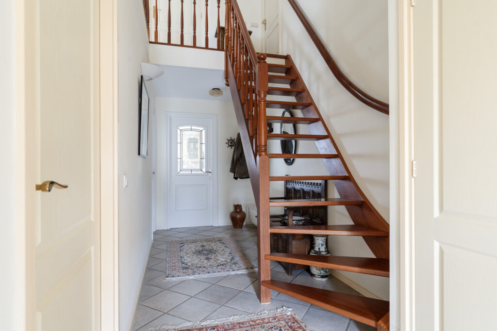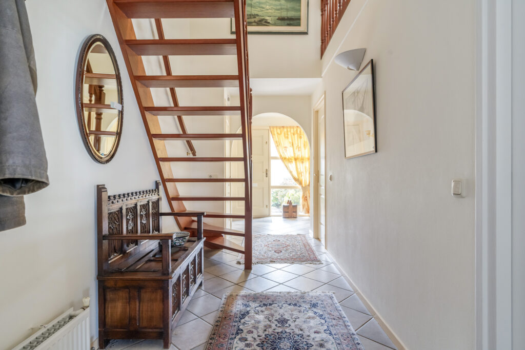 Hal/entree met vide en hardhouten trap, meterkast en toilet, slaapkame