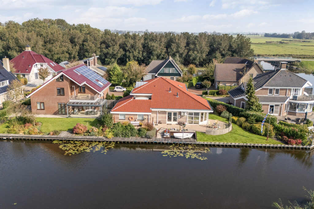 Vrijstaande villa met grote, aangebouwde garage/hobbyruimte, erg aantrekkelijk gelegen aan open vaarwater en met ruim en vrij uitzicht!