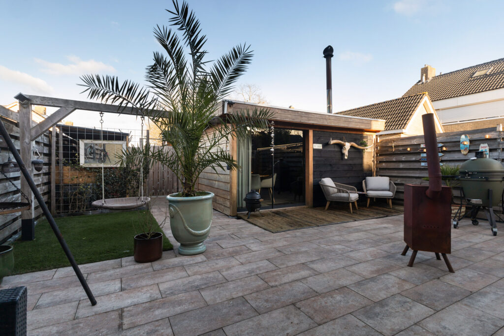 Zowel de voor- als achtertuin is compleet nieuw aangelegd en v.v. fraaie bestrating. In de achtertuin is een stoer buitenverblijf gerealiseerd. Volledig geïsoleerd, v.v. elektra en een houtkachel. Een heerlijke plek om te verblijven, het gehele jaar door. Door de schuifdeuren te openen ook een prima plek om gedurende de zomer van het mooie weer te genieten! Naast de woning is ook nog bergruimte gerealiseerd, voor o.a. de containers.