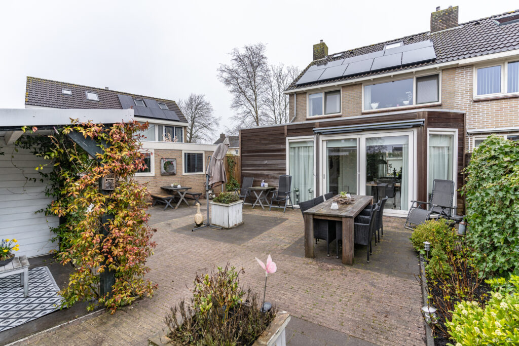 De woning beschikt over een ca. 10 meter diepe en brede, besloten achtertuin op het zuiden met erg veel privacy. De tuin beschikt over een sfeervolle overkapping en toegang tot de vrijstaande garage (ca. 19 m²). De garage is bereikbaar via de eigen oprit, ideaal voor auto, hobby of extra opslag. Dankzij de hoekligging is er extra ruimte naast de woning.