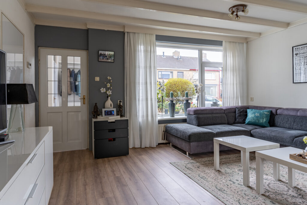 Via de zij-entree komt u binnen in de hal met toilet (hangcloset). De lichte en ruime woonkamer met balkenplafond (ca. 40 m²) en laminaatvloer is uitgebouwd (2015) aan de achterzijde en voorzien van een schuifpui. Dankzij de grote raampartijen aan voor- en achterzijde is er een prettige lichtinval. De halfopen keuken (ca. 8 m²) is geplaatst in een praktische opstelling en voorzien van diverse inbouwapparatuur. De bijkeuken met wasmachineaansluiting & extra bergruimte/provisieruimte biedt ook toegang tot de tuin.