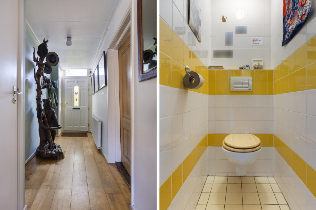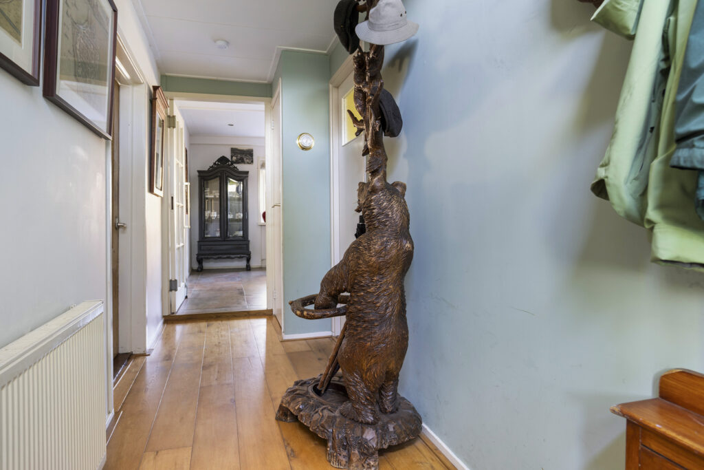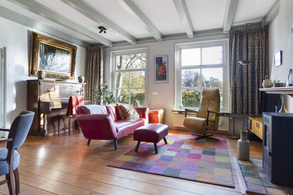 Via de entree aan de voorzijde stap je binnen in de hal met het toilet. De ruime (ca. 30 m²) woonkamer straalt sfeer en warmte uit door de houten vloerdelen, hoge balkenplafonds en grote ramen met zicht op het kaatsveld. Hier komt het karakter van de woning volledig tot zijn recht. Grenzend aan de hal bevindt zich een werk/hobbykam
