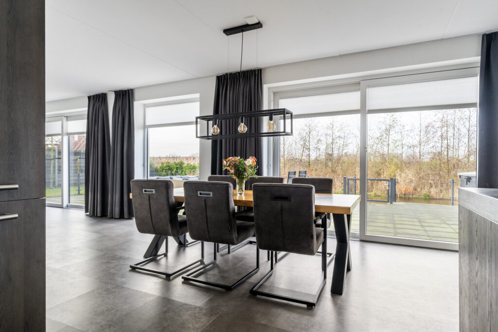 Naast de uitstekende isolerende voorzieningen, is de woning v.v. een hoogwaardig afwerkingsniveau. Zowel de begane grond als de verdieping is volledig v.v. vloerverwarming en afgewerkt met mooie pvc-vloeren. De 2e verdieping wordt verwarmd middels infrarood panelen. Alle binnendeuren uitgevoerd als zgn. stompe deuren en er is een oplaadpunt t.b.v. een elektrische auto. De gehele achtergevel van de woonkamer is bijna volledig in glas uitgevoerd en o.a. v.v. 2 brede schuifpuien, waardoor het contact met de natuur en het vaarwater optimaal beleefd wordt! Ook is er elektrisch bedienbare zonwering aangebracht. En vanzelfsprekend is er een zeer uitgebreide keukenopstelling aanwezig, alsmede fraai sanitair.