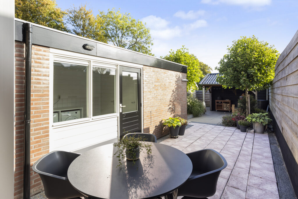 De fraai aangelegde tuin is ca. 18 meter diep en is voorzien van een achterom. Achter in de tuin staat een ruime houten schuur met overkapping (2019), de perfecte plek om te ontspannen of te klussen. De tuin is sfeervol aangelegd met bestrating, groene borders en een beschut terras onder de overkapping.